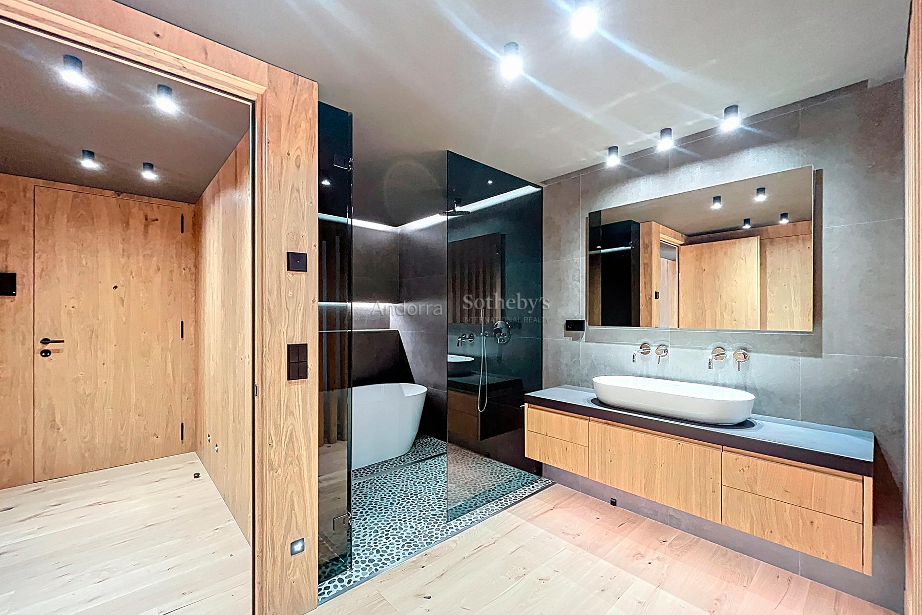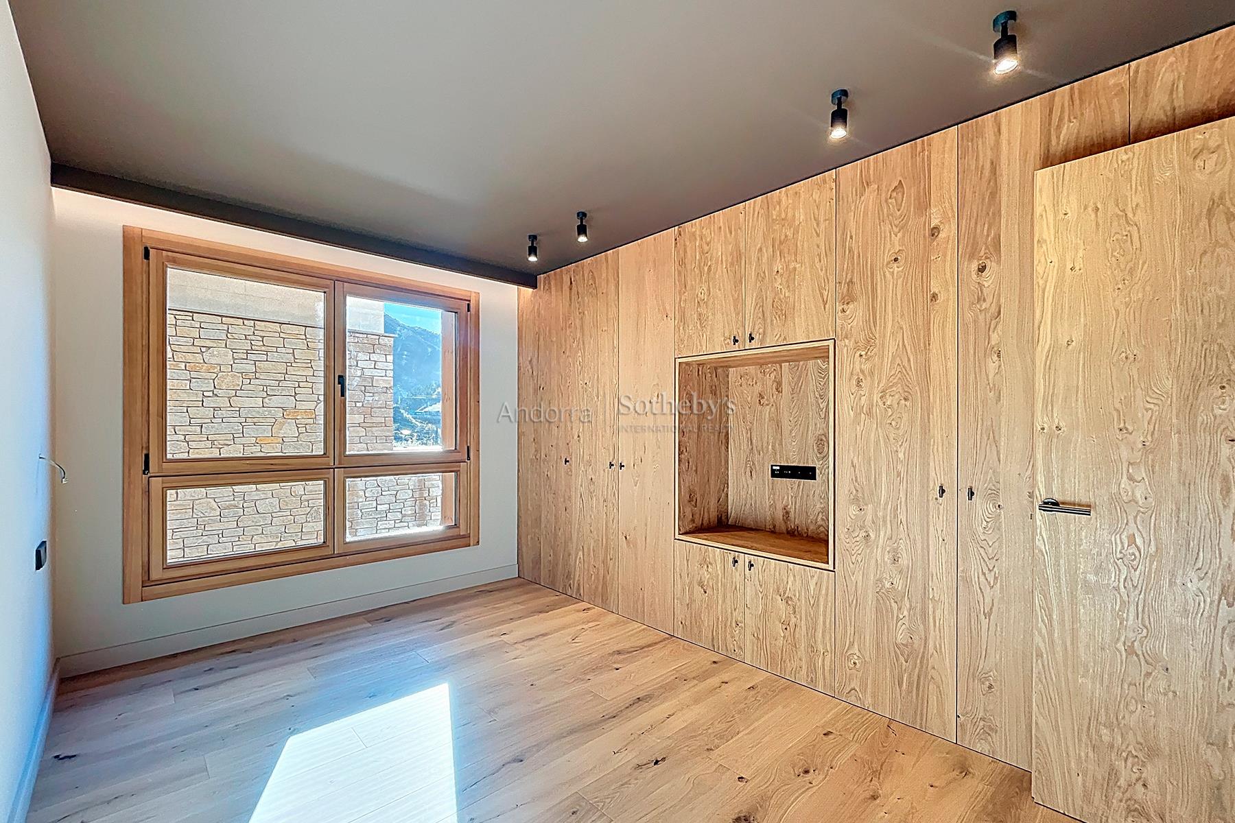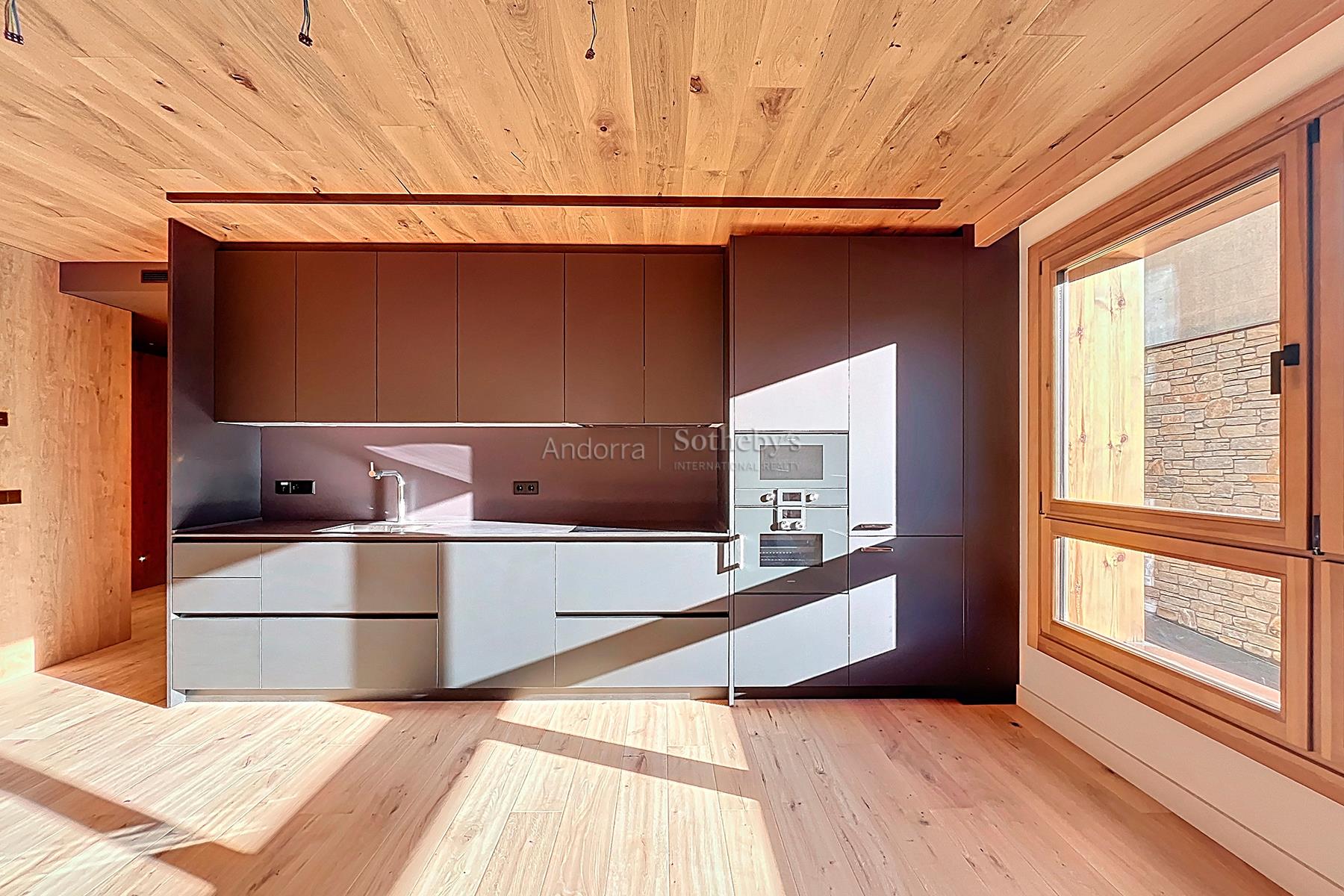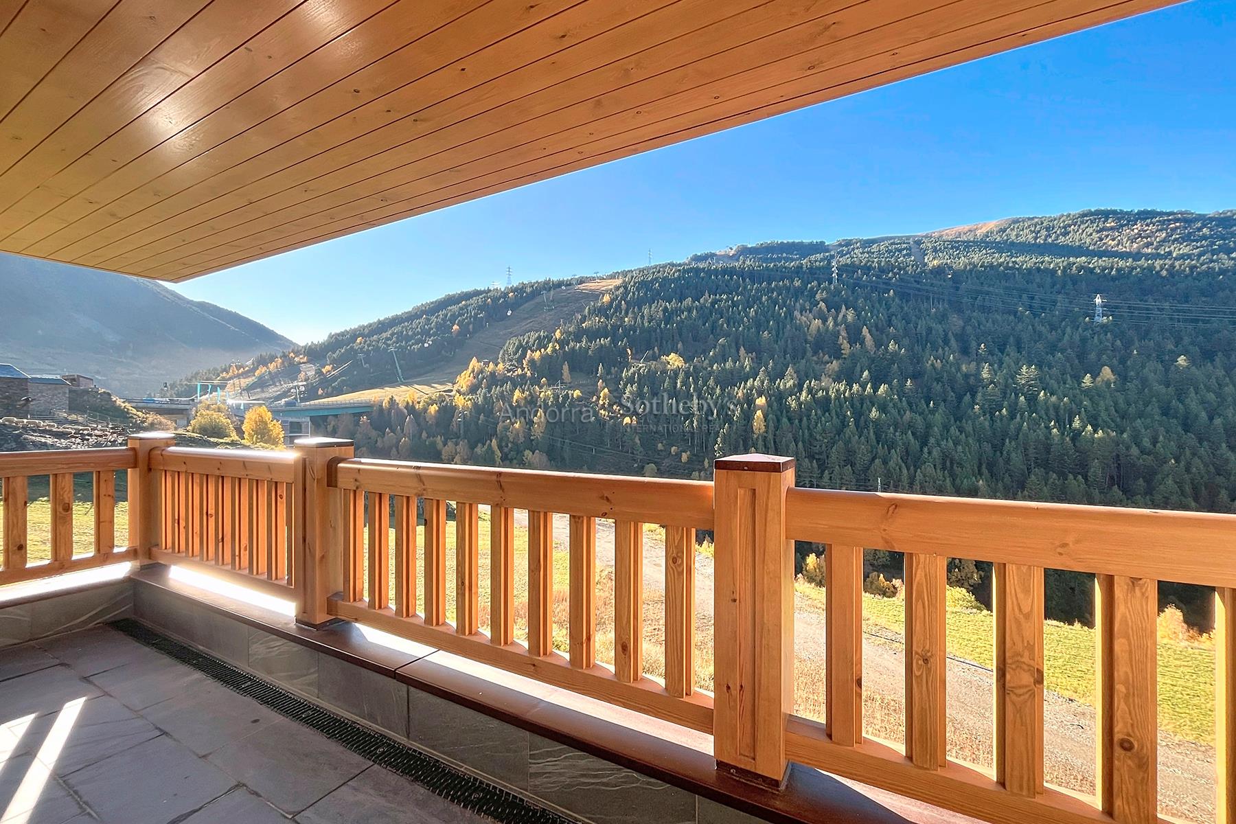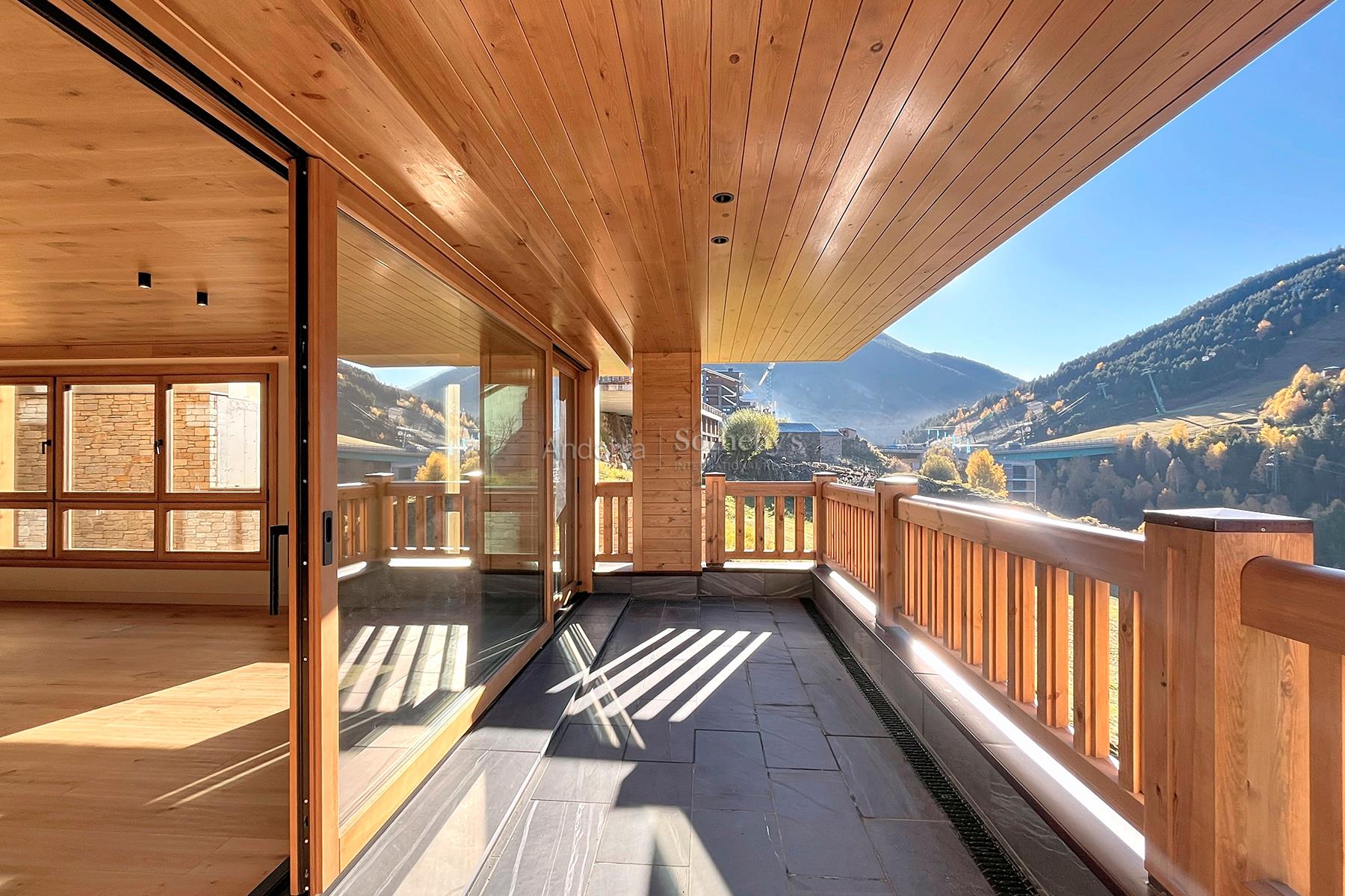 Welcome to a true luxury retreat in the heart of the majestic Pyrenees, just steps from the breathtaking ski slopes of the charming village of Soldeu. This exclusive apartment offers an unparalleled experience, where nature blends seamlessly with contemporary design, creating the perfect space for those seeking serenity and sophistication. With a meticulously designed area of 120 m², this property stands out for its structure that breathes nature, using native pine wood and local stone that harmoniously integrates into the surrounding landscape. The open-concept kitchen connects to a spacious living room, fostering memorable moments in a cozy and elegant environment. This apartment features two bedrooms, including a master suite and a double room, as well as two full bathrooms (one of them in the suite). Every corner has been thoughtfully conceived to ensure maximum comfort and functionality. The 9 m² terrace allows residents to enjoy spectacular views of the Grandvalira ski slopes and revel in the beauty of each season. Large, strategically oriented windows flood the space with natural light, immersing each room in the calm and majesty of the snowy peaks. Additionally, this magnificent apartment includes a private parking space for two vehicles, offering convenience and easy access at all times. Experience the magic of this unique space, where nature is not only observed but felt and celebrated. An exceptional place for those who wish to immerse themselves in the pure essence of mountain life in the heart of the Andorran peaks.Features