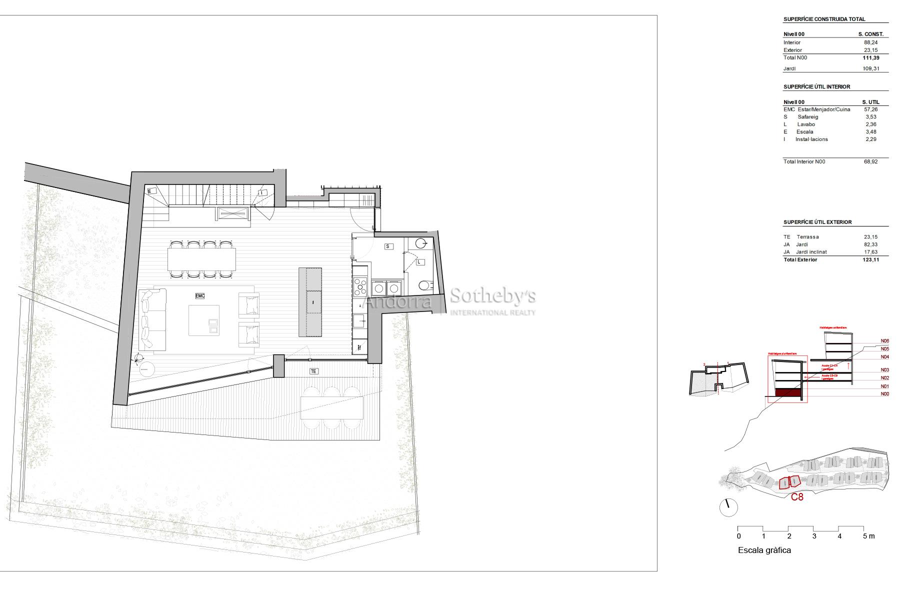 HOUSING 8.2 Welcome to your new home located in a privileged natural setting in Els Vilars, Escaldes, where elegance merges with the beauty of the Andorran landscape. This spectacular property, situated just minutes from the vibrant center of Andorra la Vella, offers immediate access to a wide range of services, shops, and leisure areas. With a design focused on sustainability, this duplex stands out for its generous openings that allow natural light to pour in, creating an atmosphere of harmony and serenity. The stunning views of the mountains and Escaldes, combined with a south-facing orientation that ensures excellent lighting throughout the day, make this residence a true oasis of tranquility. This property occupies the ground floor and first floor. It includes three comfortable bedrooms, one of which is en suite, two full bathrooms, a guest toilet, a laundry room, and a spacious garden with direct access from the living room and dining area. The ground floor features a large living room with a substantial fireplace, separated from the kitchen by an elegant island that creates two distinct areas in one space. On the first floor, the three bedrooms offer privacy and comfort. With a design aimed at energy savings, this property not only provides comfort but also includes gardens and green areas that promote an intimate and pleasurable lifestyle. Discover the true essence of Andorran living in this unique duplex, where every detail has been considered to ensure maximum comfort and a life full of harmony and beauty.Features