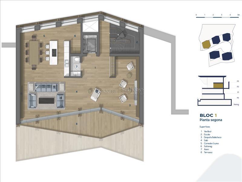 Exclusivo chalet para comprar en el encantador pueblo de Ordino, el primer destino del Principado de Andorra nombrado como Reserva de la Biosfera. Esta sensacional propiedad forma parte de una promoción de obra nueva que destaca por su privilegiada ubicación a la vez que por su lujoso diseño, ideado por el prestigioso estudio de arquitectura Rafael De La-Hoz Arquitectos. Se trata de un inmueble de nueva construcción de aproximadamente 588 m² construidos, los cuales incluyen múltiples terrazas orientadas de manera óptima para aportar la máxima exposición posible a la luz natural, y disfrutar a su vez de las magníficas vistas de Ordino y sus valles. La planta baja está destinada a la desconexión, y por ello cuenta con una increíble piscina interior con zona de spa y gimnasio, además de una sala de cine. En esta planta se encuentran además dos habitaciones dobles en suite con baño completo, un aseo y una zona de almacenamiento. En la primera planta se encuentra la continuación de la zona de descanso, con dos habitaciones en suite con baño completo, y la master suite de la propiedad, con vestidor y baño completo. Todas las habitaciones tienen salida a la terraza. La segunda planta está distribuida en una gran cocina con isla central, equipada con las últimas tecnologías, y abierta a un acogedor comedor con acceso a la terraza. En esta zona se encuentra igualmente un salón y una biblioteca, ambos espacios también con salida a la terraza, un aseo y una zona de lavandería. En la última planta, bajo tejado, se ubica un funcional despacho. Los acabados son elegantes y de la más alta calidad, y el diseño de la propiedad combina elementos modernos, como las grandes vidrieras, con la clásica arquitectura andorrana en piedra y madera para integrarse de la mejor manera en el entorno y no perder la esencia del país.Características