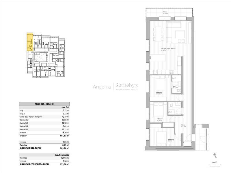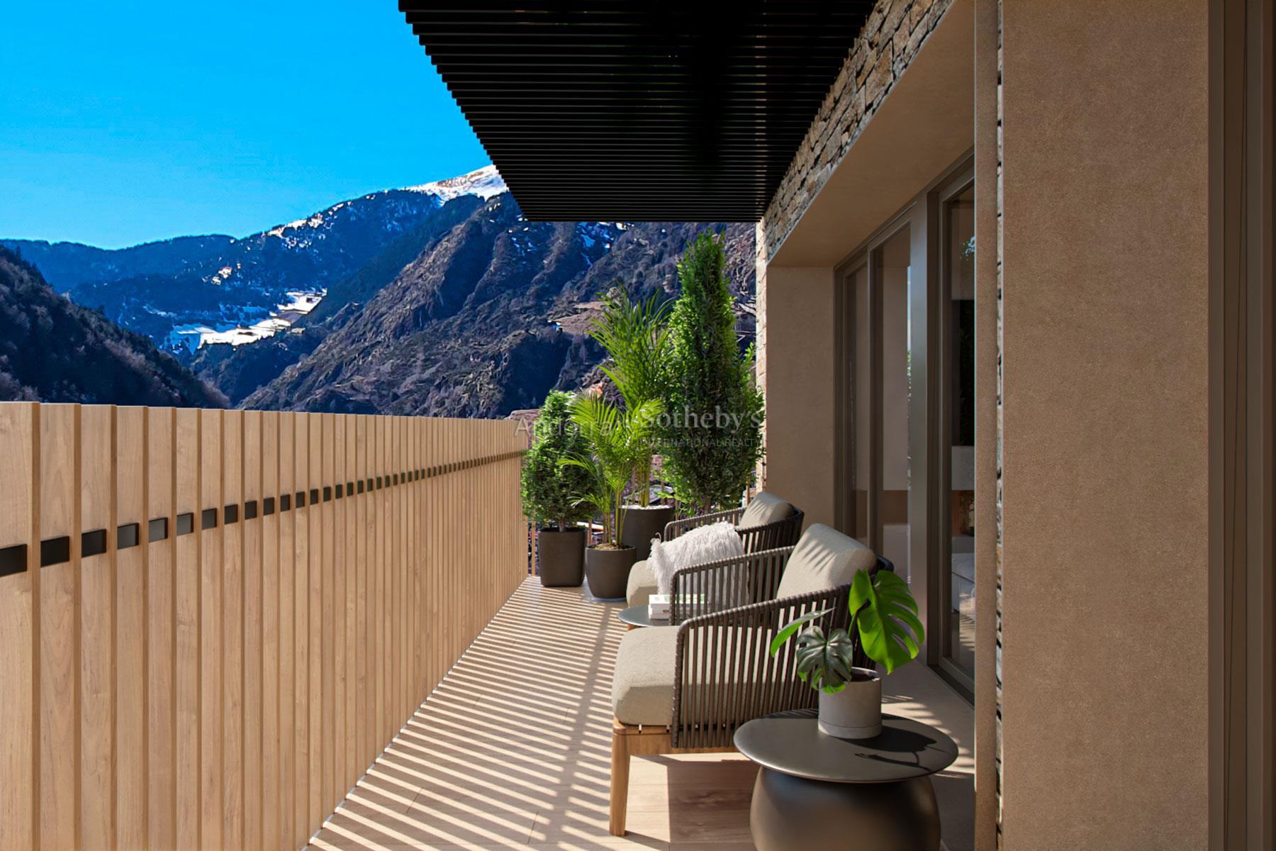 Descubre esta magnífica obra nueva ubicada en El Tarter, piso nº 201, situado en la 2ª planta. Con una superficie construida de 109,60 m², esta propiedad ofrece un espacio moderno, luminoso y funcional, ideal para disfrutarlo durante todo el año. La cocina integrada con el salón-comedor, en un único ambiente, crea una sensación de amplitud y confort, perfecta tanto para el día a día como para recibir invitados. Desde este espacio se accede a una agradable terraza de 8,03 m², con orientación sureste, que garantiza una excelente entrada de luz natural. La vivienda dispone de tres habitaciones, dos de ellas en suite, y una habitación individual, así como dos baños completos, diseñados con materiales de calidad y un estilo contemporáneo. El edificio ofrece box privado y plazas de aparcamiento (pendiente de confirmar), aportando una comodidad extra y la tranquilidad de tener los vehículos protegidos del frío y la nieve. Esta propiedad está equipada con prestaciones de alto nivel, como iluminación LED de bajo consumo, suelo radiante y una elegante chimenea eléctrica que aporta calidez y sofisticación. Además, incorpora sistema de domótica, que permite gestionar fácilmente los distintos sistemas del hogar desde el teléfono inteligente. Los electrodomésticos de primera calidad garantizan una excelente experiencia culinaria, mientras que los suelos de gres porcelánico aportan durabilidad, elegancia y un acabado moderno. La comunidad dispone de un spa y zona de relax comunitaria, con piscinas y jacuzzis, pensados para crear un auténtico espacio de bienestar. Un patio central con zona verde completa este entorno exclusivo, ofreciendo tranquilidad y contacto con la naturaleza. No dejes escapar la oportunidad de vivir en esta exclusiva propiedad de obra nueva en El Tarter.