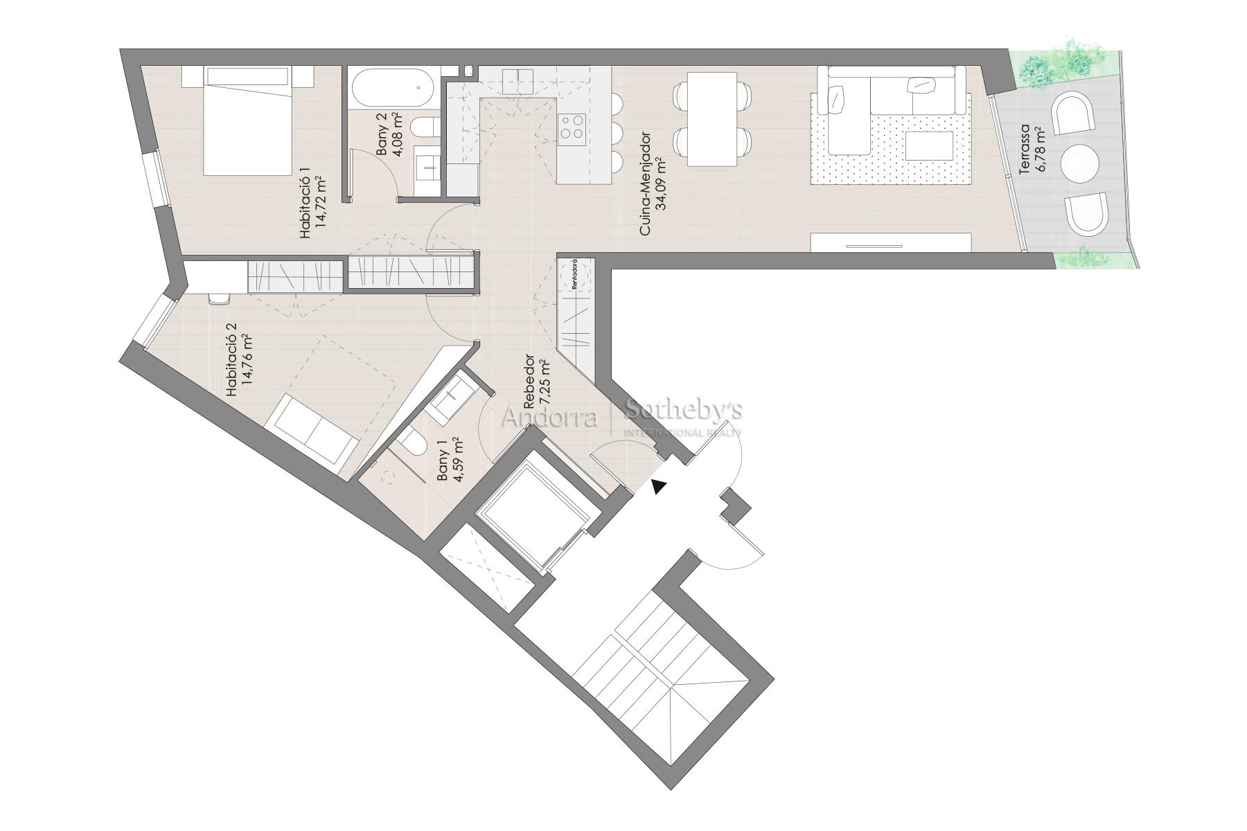 Aquest magnífic pis d’obra nova, en construcció, es troba a tocar de la principal avinguda comercial de la Massana, en una zona residencial familiar prop de la piscina comunal i les pistes de tennis, molt tranquil·la i perfectament comunicada. Té a disposició tots els serveis necessaris i es troba a només 400 metres del telecabina que permet accedir a les pistes d’esquí del domini de Pal-Arinsal. El pis té 100m² distribuïts en un gran saló menjador amb accés a una terrassa de 6m², una àmplia cuina, integrada al menjador, equipada amb electrodomèstics de gama alta. A la zona de descans hi ha 2 habitacions, una d’elles en suite amb bany complet, l´altra individual, i totes dues amb armaris encastats. També hi ha un segon bany complet. La propietat disposa d´una plaça d’aparcament al mateix edifici. Orientat a est, el pis gaudeix del sol des de les primeres hores de dia fins a mitja tarda, i té vistes al Camí Ral, amb el riu i a la vall de la Massana. Aquest exclusiu apartament, perfectament situat, és una excel·lent inversió per una família que busqui una residencia de prestigi al centre d’una ciutat amb el dinamisme de La Massana i vol gaudir de la seva gran oferta d’activitats amb tot l’espai i les comoditats necessàries.Característiques