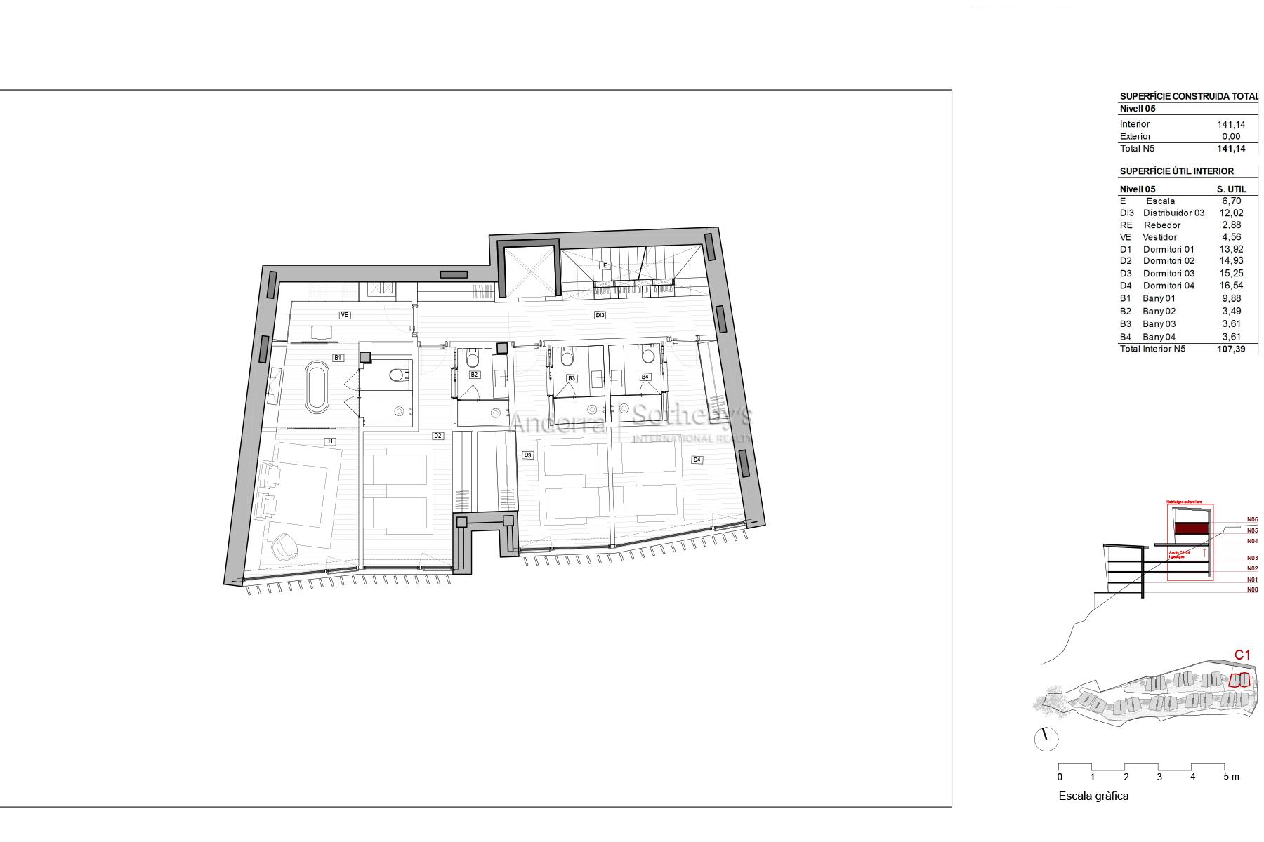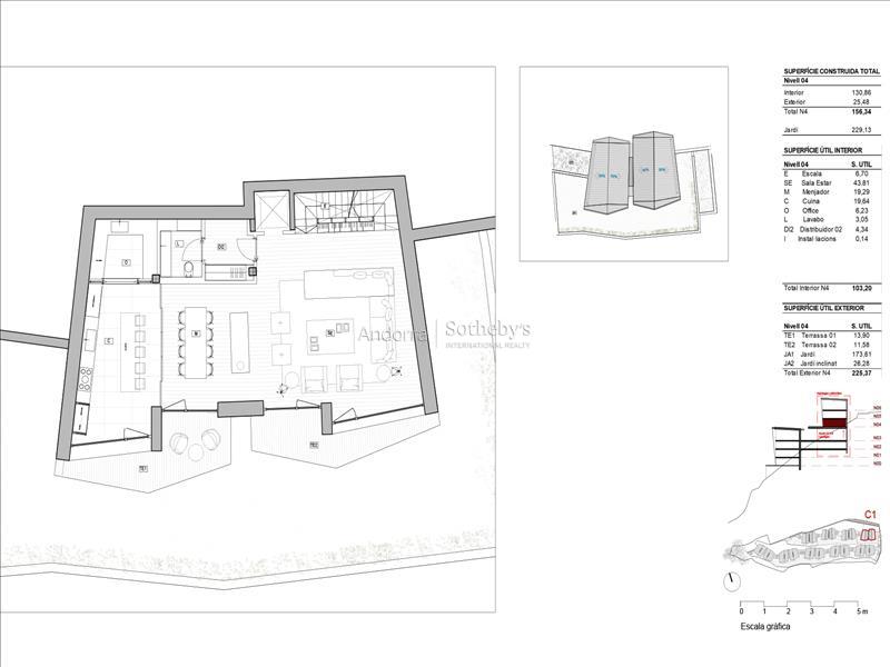 CASA 1 Bienvenido a su nuevo hogar en Els Vilars, Escaldes, donde la elegancia y la naturaleza se fusionan en perfecta armonía. Situada en un entorno natural privilegiado, esta villa unifamiliar se encuentra a tan solo unos minutos del vibrante centro de la capital andorrana, ofreciendo un acceso inmediato a todos los servicios, comercios y áreas de ocio que la ciudad ofrece. Diseñada con un enfoque sostenible, esta propiedad destaca por su estructura con amplios ventanales que permiten la entrada de luz natural, creando un ambiente de tranquilidad y pureza. Las impresionantes vistas a Escaldes y las majestuosas montañas que la rodean aportan un valor añadido, y su orientación sur garantiza una iluminación excepcional durante todo el día, desde el amanecer hasta el atardecer. La entrada a la villa revela una planta baja acogedora, diseñada para la zona de día, con una moderna sala de estar y una cocina con isla independiente que se distingue por su funcionalidad. Todas las estancias de la planta baja conectan directamente con una bonita terraza-jardín, proporcionando un espacio ideal para disfrutar del clima y del entorno natural. En la planta primera, encontrará un área reservada para la zona de noche, con cuatro suites equipadas con baño privado y armarios independientes, garantizando la máxima privacidad y confort. La planta segunda se transforma en un auténtico oasis de bienestar, con un gimnasio, piscina, spa y sala polivalente, todo ello con las mejores vistas de la región. Finalmente, el sótano ofrece un amplio aparcamiento, trastero y lavadero, así como un acceso fácil y funcional a la vivienda. Con un diseño pensado para el ahorro energético, esta villa complementa su confort con jardines y zonas verdes que crean un espacio de vida íntimo y placentero. Descubra la verdadera esencia de la vida andorrana en esta villa única, donde cada detalle ha sido cuidado para ofrecerle el máximo confort y una vida plena de armonía y belleza.