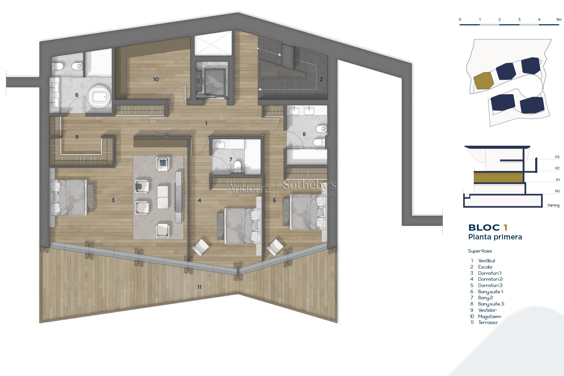 Exclusivo chalet para comprar en el encantador pueblo de Ordino, el primer destino del Principado de Andorra nombrado como Reserva de la Biosfera. Esta sensacional propiedad forma parte de una promoción de obra nueva que destaca por su privilegiada ubicación a la vez que por su lujoso diseño, ideado por el prestigioso estudio de arquitectura Rafael De La-Hoz Arquitectos. Se trata de un inmueble de nueva construcción de aproximadamente 588 m² construidos, los cuales incluyen múltiples terrazas orientadas de manera óptima para aportar la máxima exposición posible a la luz natural, y disfrutar a su vez de las magníficas vistas de Ordino y sus valles. La planta baja está destinada a la desconexión, y por ello cuenta con una increíble piscina interior con zona de spa y gimnasio, además de una sala de cine. En esta planta se encuentran además dos habitaciones dobles en suite con baño completo, un aseo y una zona de almacenamiento. En la primera planta se encuentra la continuación de la zona de descanso, con dos habitaciones en suite con baño completo, y la master suite de la propiedad, con vestidor y baño completo. Todas las habitaciones tienen salida a la terraza. La segunda planta está distribuida en una gran cocina con isla central, equipada con las últimas tecnologías, y abierta a un acogedor comedor con acceso a la terraza. En esta zona se encuentra igualmente un salón y una biblioteca, ambos espacios también con salida a la terraza, un aseo y una zona de lavandería. En la última planta, bajo tejado, se ubica un funcional despacho. Los acabados son elegantes y de la más alta calidad, y el diseño de la propiedad combina elementos modernos, como las grandes vidrieras, con la clásica arquitectura andorrana en piedra y madera para integrarse de la mejor manera en el entorno y no perder la esencia del país.Características