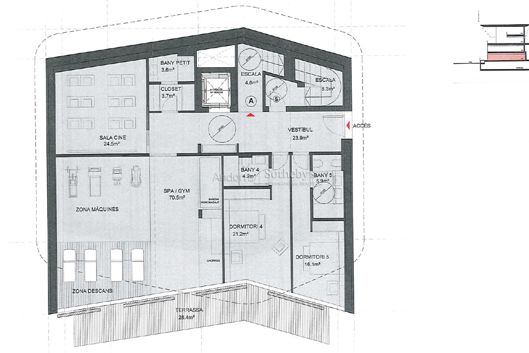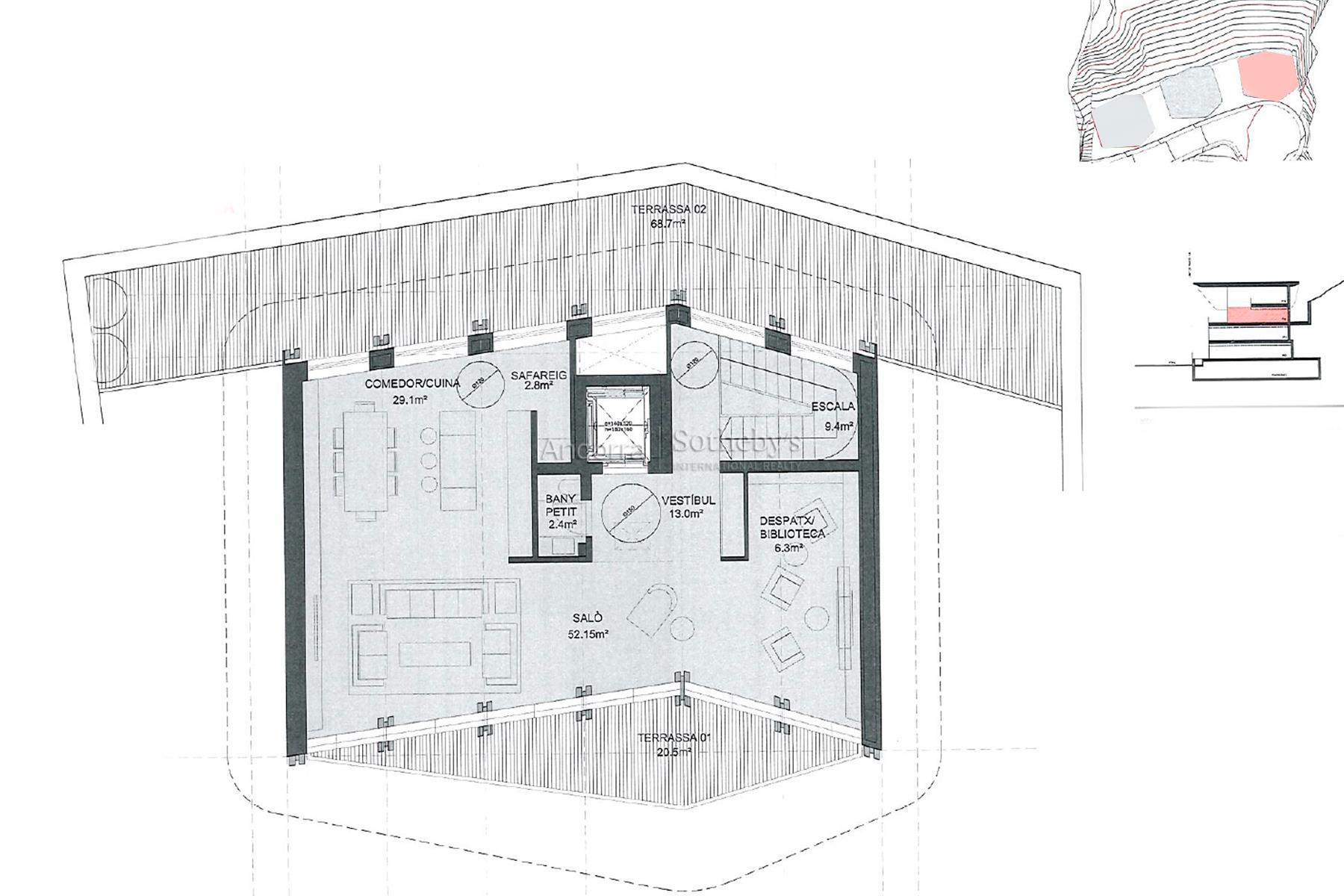 Chalet exclusivo en venta en el encantador pueblo de Ordino, primer destino del Principado de Andorra designado como Reserva de la Biosfera. Esta sensacional propiedad forma parte de una promoción de nueva construcción que destaca por su privilegiada ubicación así como por su diseño lujoso, ideado por el prestigioso estudio de arquitectura Rafael De la-Hoz Arquitectes. Se trata de un inmueble de nueva construcción de aproximadamente 615 m² construidos, que incluye múltiples terrazas orientadas de manera óptima para aportar la máxima exposición posible a la luz natural, mientras se disfrutan de las magníficas vistas de Ordino y sus valles. La planta baja está destinada a la desconexión, por lo que cuenta con una zona de spa y gimnasio, además de una sala de cine. En esta planta también hay dos habitaciones dobles en suite con baño completo, un aseo y una zona de almacenamiento, así como una amplia terraza. En el primer piso se encuentra la continuación de la zona de descanso, con dos habitaciones en suite con baño completo y la suite principal de la propiedad, con vestidor y baño completo. Todas las habitaciones tienen salida a la terraza. La segunda planta está distribuida en una gran cocina con isla central, equipada con las últimas tecnologías, y abierta a un acogedor comedor con acceso a la terraza. En esta zona también hay un salón y una biblioteca, ambos espacios también con salida a la terraza, un aseo y una zona de lavandería. En la última planta, con techos inclinados, se encuentra un despacho funcional. La propiedad dispone de 2 garajes para 3 coches cada uno, además de un trastero. Los acabados son elegantes y de la más alta calidad, y el diseño de la propiedad combina elementos modernos, como las grandes cristaleras, con la arquitectura clásica andorrana en piedra y madera para integrarse de la mejor manera en el entorno y no perder la esencia del país.Características