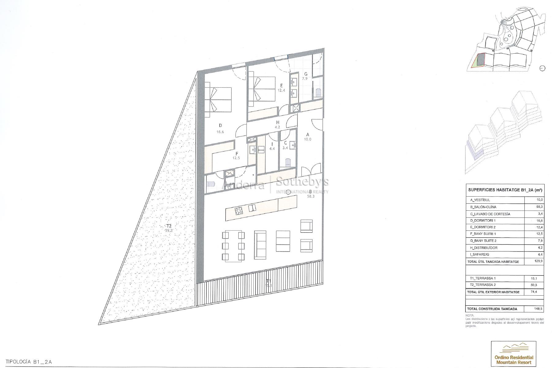 Nuevo piso exclusivo para comprar en plena naturaleza, con elementos de alta gama, con todos los detalles para el máximo confort y vistas inmejorables. Situado a pocos pasos de Ordino ya pocos minutos del telecabina que accede al dominio esquiable de Vallnord y del dominio de Grandvalira sector de Ordino - Arcalís. Garaje privado y sistema de climatización. La elegante propiedad en venta de 148,5 m² se estructura en dos habitaciones en suite, dos baños, un aseo, dos tranquilas terrazas de 74,4m² ambas; además de parquing de dos plazas. Nueva promoción residencial de lujo en una zona privilegiada y privada de la Parroquia de Ordino. Desarrollo urbanístico exclusivo y único en el Principado de Andorra. Arquitectos: Rafael de La-Hoz Ricard de Deus - COAA Nº90